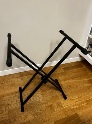 Soporte para teclado en color negro. Es un accesorio práctico y funcional. - Estructura metálica. - Ajustable en altura y anchura. - Plegable para facilitar su transporte y almacenamiento. - Medidas: 96 cm x 35 cm.