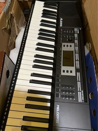 Teclado electrónico Alesis Melody 61, ideal para principiantes. Incluye altavoces integrados. Tiene una tecla un poco doblada, pero no influye en el funcionamiento. - Soporte para teclado. - No incluye Banqueta. - Auriculares. - Micrófono. - No incluye Atril para partituras. - 300 sonidos y lecciones de música.