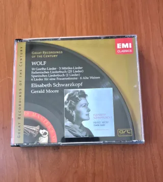 Preguntar posibilidad de envio. Ver precio individual - Hugo Wolf 62 lieder 2 CD interpretados por Elisabeth Schwarzkopf y acompañada al piano por Gerald Moore. Rosette de la Guía Penguin. Great Recordings of the Century. Sello EMI Classics. Precio 7 € - Hugo Wolf Lieder Recital de Elisabeth Schwarzkopf en el Festival de Salzburgo, grabación en vivo de 1938 con Gerald Moore al piano. Precio 3 €