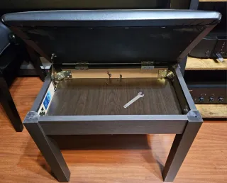 Banco para piano en perfecto estado. Su diseño oscuro y elegante se adapta a cualquier espacio. - Asiento acolchado. - Compartimento interior. Sólo para recogida y pago en mano.