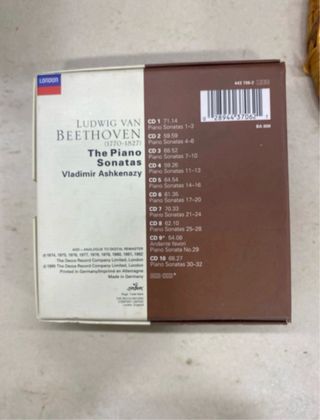 Caja con 10 CDs con la grabación completa de las Sonatas para Piano de Beethoven interpretadas por Vladimir Ashkenazy. Grabaciones de 1974-1982. Edición de 1985 - Sello discográfico London.
