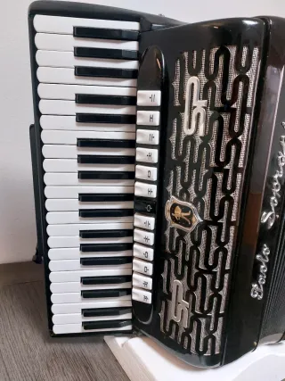 Acordeón Paolo Soprani Super paolo de 120 bajos con doble cassotto en el 16"(basson) y en el 8"(clarinete). Afinación piccolo. 4 voces en la derecha con 13 registros y 5 voces en los bajos con 7 registros. Un acordeon de calidad de sonido excelente. Estado de conservación óptimo, muy mimado