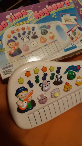 Teclado musical infantil de la marca Fun Time Keyboard. Un juguete clásico para los más pequeños. - Diseño colorido con animales de granja. - Incluye figuras de estrellas y notas musicales. - Botón Try Me para probar sus funciones - Funciona bien.