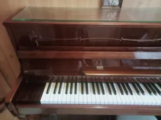 Piano vertical de madera oscura, ideal para practicar y disfrutar de la música. - Teclas blancas y negras. - Diseño clásico y elegante.