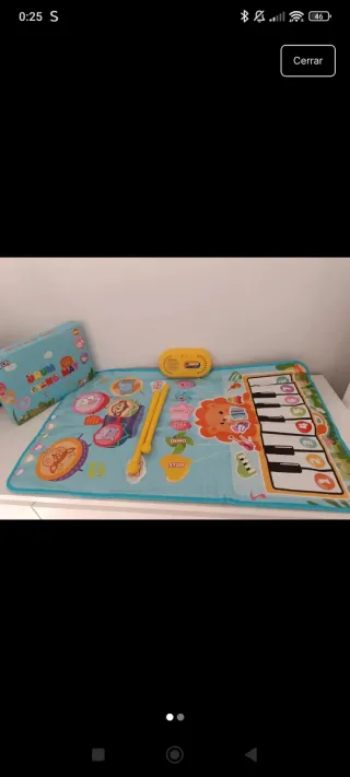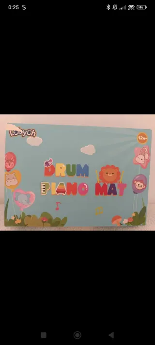 Alfombra interactiva para niños con diseño de piano y tambores. - Incluye un módulo de sonido amarillo. - Viene con dos baquetas. - Decorada con animales y notas musicales. - está totalmente nueva sin estrenar en su caja