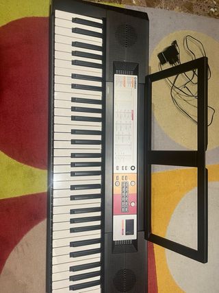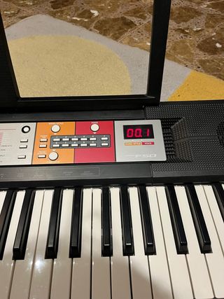 Teclado electrónico Yamaha F50 con pantalla digital. - Panel de control con botones para funciones. - Teclas blancas y negras. - Soporte para partituras.
