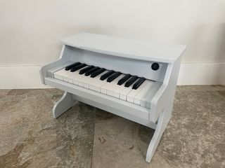 Precioso piano de madera para niños. Ideal para iniciarse en la música. - Diseño de piano de cola. - Acabado en color blanco. - Funciona con pilas.