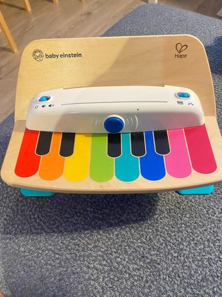Piano de madera Baby Einstein Magic Touch de Hape. Un juguete musical con teclas de colores. - Fabricado en madera. - Teclas de colores. - Diseño de Baby Einstein y Hape. El piano está bien pero las tarjetas están con signos evidentes de uso.