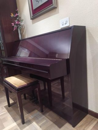 Piano vertical de madera oscura color caoba, ideal para practicar. - Acabado brillante. - Incluye banqueta a juego. Hay que venir a buscarlo (Zaragoza, piso 6º)