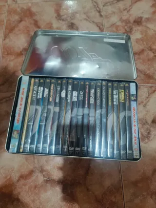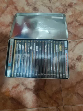 Colección de películas de James Bond en formato DVD. Incluye títulos icónicos de la saga. - Vive y deja morir - Octopussy - Alta Tensión - Moonraker - Solo para sus ojos - El hombre de la pistola de oro - Goldeneye - El mañana nunca muere - Solo se vive dos veces - Al servicio secreto de Su Majestad - Diamantes para siempre - Desde Rusia con amor - Dr. No - Goldfinger - Operación Trueno - La espía que me amó - Panorama para matar - Licencia para matar - El mundo nunca es suficiente - Muere otro día - Casino Royale - Quantum of Solace - Skyfall - Spectre - Sin tiempo para morir