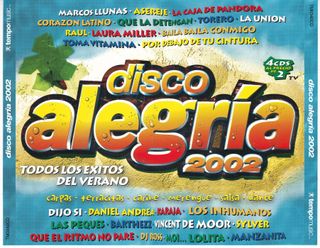 Various - Disco Alegría 2002 Label: Tempo Music - TM0340CD Format: 3 x CD, Compilation + CD, Mixed Country: Spain Released: 2002 Genre: Electronic, Latin, Pop. Style: Trance, Europop, House. Tags: Makina Maquina Hard Trance Hard House Trance Techno Italodance Hardcore Gabber Remember Lote Discos Vinilo CDs Maleta Plato Technics Mesa Pioneer Aguja Capsula Ortofon Traktor Pastis Buenri Pont Aeri Xque Scorpia Overdrive Attica AREA DJ EDM Radical Bonzai VALE MUSIC MAX BLANCO Y NEGRO INSOLENT Recopilatorios