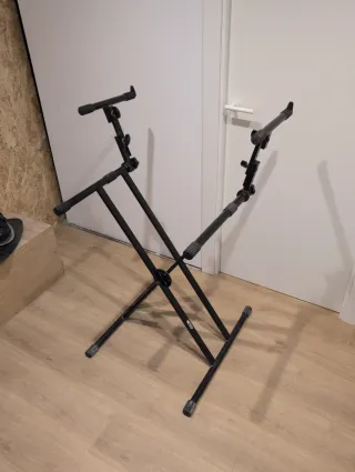 Soporte negro para equipo DJ, con diseño en tijera para fácil ajuste y transporte. - Estructura metálica. - Brazos ajustables en altura y anchura. - Pies de goma para mayor estabilidad.