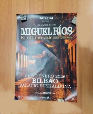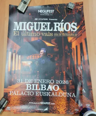 Pósters oficiales de la gira El último vals de Miguel Ríos en Bilbao. Con alguna doblez leve y marcas de chinchetas por haber estado colgados. - 43.4 cm de alto x 31 cm de ancho. -Fecha: 31 de enero de 2026. - Lugar: Palacio Euskalduna. - Parte del ciclo musical Negufest 2026.