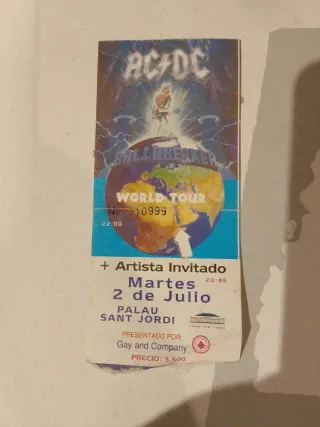 Entrada original del concierto de AC/DC en Barcelona en 1996. - Concierto: AC/DC Ballbreaker World Tour. - Fecha: Martes, 2 de Julio. - Lugar: Palau Sant Jordi, Barcelona. - Hora: 20:45. - Presentado por: Gay and Company. - Precio original: 3.500.