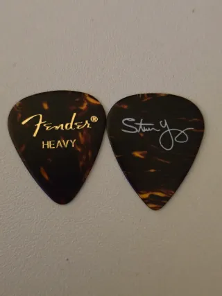 Púa de guitarra con la firma de Stevie Young, guitarrista rítmico de la banda de rock AC/DC + púa de Fender Heavy RECOGIDAS EN ESCENARIO! Objetos de colección muy específico de la gira Power Up Tour 2025 en el Estadio Riyadh Air Metropolitano de Madrid, donde AC/DC ofreció dos conciertos históricos los días 12 y 16 de julio de 2025.