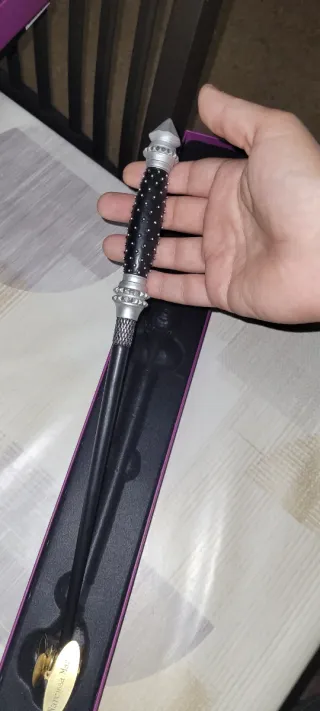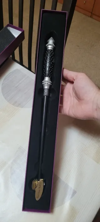 Réplica de la varita de Narcissa Malfoy de Harry Potter, presentada en su caja original. - Diseño detallado del mango con acabado plateado y negro. - Incluye una placa dorada con el nombre 'Narcissa Malfoy'. -Edición character, nunca expuesta - Funda protectora de la caja Posibilidad de entrega en mano en <M > Can Tries. Envíos a través de wallapop o por correos según tarifas