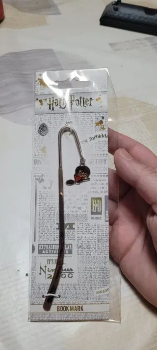 Un bonito punto de libro con temática de Harry Potter. Ideal para los amantes de la saga. - Diseño de Harry Potter volando en escoba. - Material metálico. - Incluye colgante. - Presentado en su embalaje original. Posibilidad de entrega en mano en <M> Can Tries. Envíos a través de wallapop o por correos según tarifas.