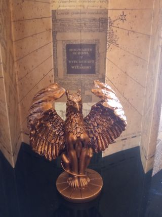 Estatua decorativa del Grifo protector que custodia la puerta del despacho del Director del Colegio de magia y hechicería, Albus Dumbledore. Este ser mitológico, que tiene cuerpo de león y cabeza de águila, es un símbolo de sabiduría y valentía, características propias de la casa Gryffindor. Ideal para decorar un escritorio o estantería de todo fan de la saga de Harry Potter.