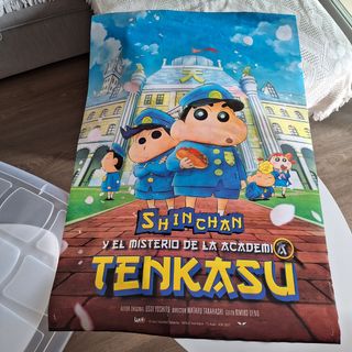 Cartel de cine de la película de Shin chan y el misterio de la academia Tenkasu. El póster está perfecto a excepción de una pequeña rajita en la parte de abajo
