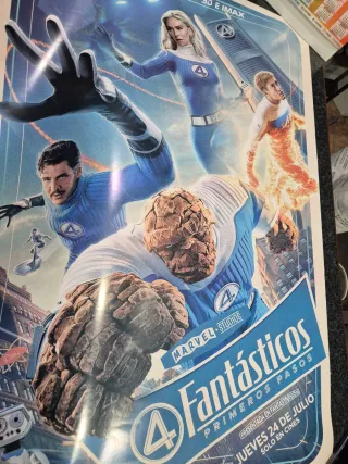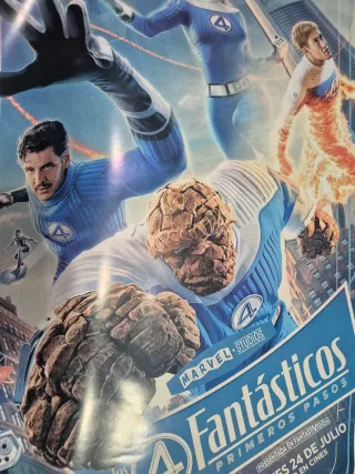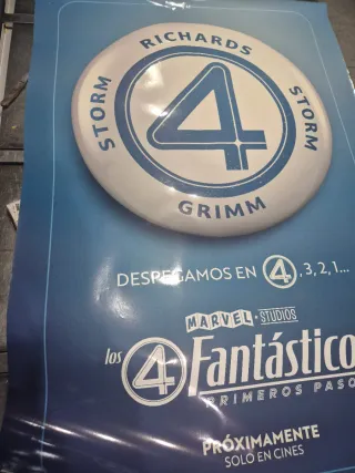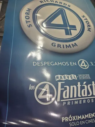 Póster promocional de la película Los 4 Fantásticos. Original de cine de la pelicula medidas 97x68cm - Diseño con el logo clásico del 4. - Incluye nombres de personajes como Richards, Storm y Grimm. - Texto Próximamente solo en cines y Marvel Studios.
