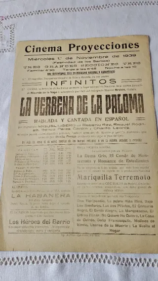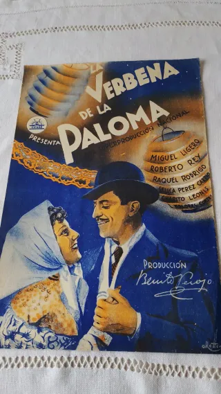 Cartel original de la película La Verbena de la Paloma de 1939. Presenta una ilustración vibrante de la pareja protagonista. Tonos azules Pasquín con publicidad del cine - Superproducción Nacional - Actores: Miguel Ligero, Roberto Rey, Raquel Rodrigo, Elica Pérez Carpio, Charito Leonis - Producción: Benito Perojo Medidas Altura 33Cms Ancho 22 Cms. Vendo colección de programas de mano desde 1935_ 1970. Contacta conmigo.