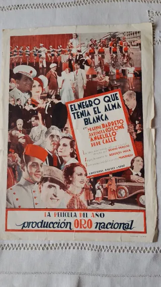 Programa de cine de la película El negro que tenía el alma blanca 1934 Película del año Producción Oro Nacional - Protagonistas: Marino Barreto, Antonia Colome, Angelillo, Pepe Calle Exclusivas Balart y Simó Marca de haber estado doblado. Defectos en el margen blanco. Medidas Alto 35 Cms Ancho 25'50 Cms Vendo Colección de programas de mano 1935_ 1970 Contacta Conmigo