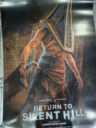 Póster promocional de la película Return to Silent Hill. Original cine cine medidas 97x68cm - Diseño con la icónica señal de bienvenida. - Imagen de un personaje solitario en un ambiente brumoso. - Incluye créditos de producción y logo de Konami.
