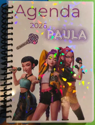 Agenda personalizada con temática K-Pop, personalizadas con el nombre que quieras. - Diseño con personajes de estilo K-Pop. - Incluye el año 2026. - Detalle de Huntrix con un micrófono. - Acabado holográfico brillante. -Tamaño A5 -Personalizable con el nombre que quieras, después de la compra, enviar mensaje con el nombre elegido. -170 hojas más las tapas.