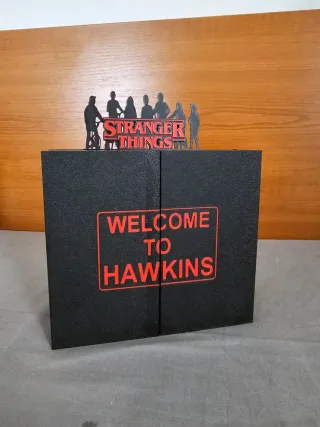 Expositor temático de Stranger Things, con el logo de Hawkins. - Diseño con siluetas de los personajes. - Cartel Welcome to Hawkins en rojo. -nuestros productos son nuevos, no esta comprando un articulo de segunda mano se lleva uno recien hecho -Llevamos tus ideas al mundo 3D — regalos para cumples , bodas , bautizos etc -convertimos ideas en productos no dude en preguntarnos , tenemos un amplio catalogo y creamos productos totalmente personalizados - Diseños 3D únicos para tu evento , marca o empresa -📱 TikTok: @gretos.3d
