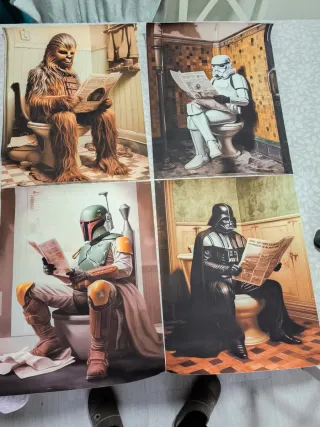 Conjunto de cuatro láminas decorativas de Star Wars con personajes icónicos en situaciones cotidianas. Medidas 40 ancho x 50 alto - Lámina de Chewbacca en el baño. - Lámina de Stormtrooper en el baño. - Lámina de Boba Fett en el baño. - Lámina de Darth Vader en el baño.
