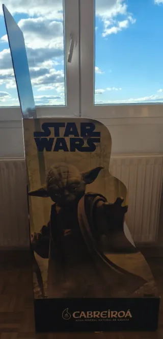 Expositor promocional de la marca Cabreiroa con ilustraciones a gran escala de Star Wars, personajes R2-D2, Darth Vader y Yoda. - Diseño llamativo con los personajes de la saga y logo de Star Wars. - Material de cartón resistente. Expositor de botellas de edición especial de personajes de la saga. Precio por uno, negociable comprando los dos (última foto). Escucho ofertas.