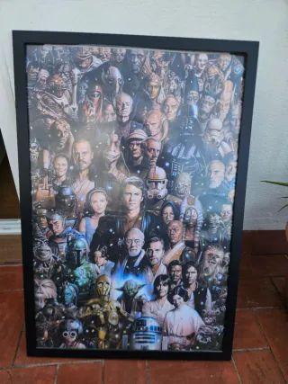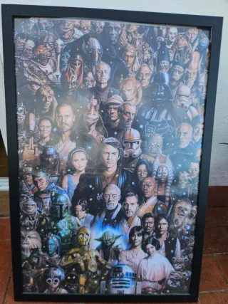 Marco con póster de Star Wars, ideal para los fans de la saga. - Diseño con múltiples personajes icónicos. - Marco negro de madera con protector em platico