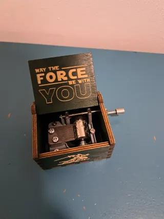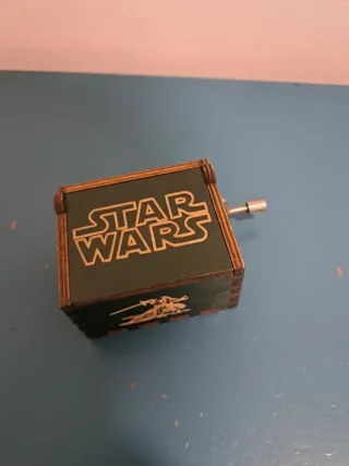 Caja musical con diseño de Star Wars. - Grabado del logo de Star Wars en la tapa. - Ilustración de personaje de Star Wars en el lateral. - Mecanismo de manivela para reproducir música.