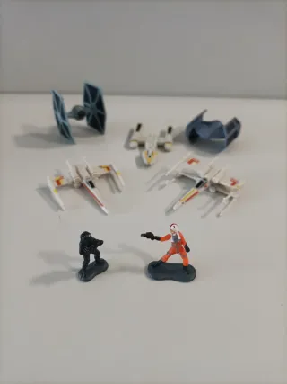 Conjunto de siete miniaturas de naves y personajes de la saga original de Star Wars. - Incluye naves icónicas como el TIE Fighter y el X-Wing. - Figuras de piloto de la Alianza Rebelde y piloto del Imperio. - Ideal para coleccionistas y fans de Star Wars. Nuevo, en perfecto estado, incluye blíster original.