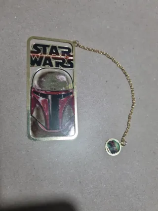 Marcapáginas metálico con diseño de Star Wars. - Acabado dorado. - Ilustración del casco de Boba Fett. - Cadena con pequeño colgante. - Licencia oficial de Star Wars.