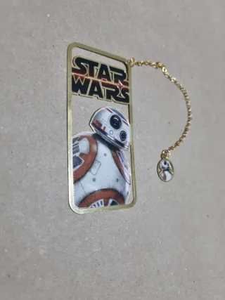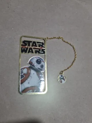Marcapáginas metálico con diseño de Star Wars y el personaje BB-8. Incluye una pequeña cadena con un charm. - Diseño de Star Wars. - Personaje BB-8. - Acabado dorado.