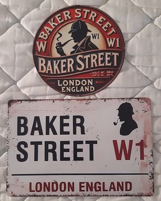Regalo Ideal para Amantes de la Intriga y el Suspense de Sherlock Holmes. Los 2 Letreros por 9,50 e. Letrero 1 - Diseño - Perfil de Sherlock Holmes con pipa y nombre de la calle donde residia "Baker Street" London. Medidas - 20 X 20 cm. Material - Aluminio. Letrero 2 - Diseño - Perfil de Sherlock Holmes con pipa y nombre de la calle donde residia "Baker Street" London. Medidas - 30 X 20 cm. Material - Aluminio Conjunto de dos letreros metálicos con diseño vintage de Baker Street. - Diseño inspirado en la calle Baker Street de Londres. - Estilo retro con acabado envejecido. - Incluye silueta de Sherlock Holmes fumando en pipa