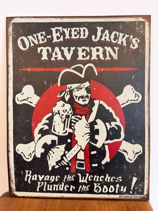 Póster de metal con diseño vintage de One-Eyed Jack's Tavern. - Diseño temático de piratas. - Estilo retro y desgastado. - Ideal para decoración temática.