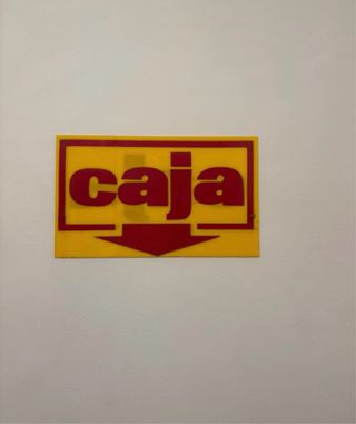 Póster vintage de los años 90 con diseño retro. - Fondo amarillo. - Texto Caja en rojo. - Flecha indicadora en rojo.