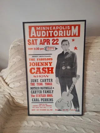 Cartel vintage enmarcado del concierto de Johnny Cash en el Minneapolis Auditorium. Medidas 36x59 - Impreso en 2014.