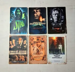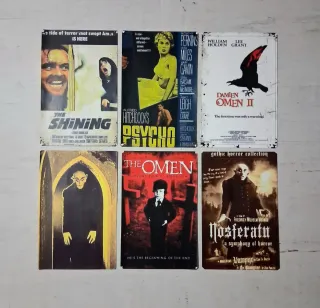 Conjunto de seis placas decorativas metálicas con motivos de películas de terror clásicas. - The Shining - Psycho - Damien Omen II - The Omen - Nosferatu - Película de Drácula (sin título visible) Hay muchas mas placas en mi perfil de Wallapop y en cada anuncio hay mas fotos con mas placas, 1PLACA=4€ unidad 3 a 3.75€=11,25€ el lote 5 a 3,50€=17,5€ el lote 10 a 3,25€=32,5€ el lote 20 a 3€=60€ el lote 50 a 2,75€= 137,5€ el lote 100 a 2.5€= 250€ el lote en madera de 3mm de grosor, muy duras y rigidas, estandar 19×29cm, hacemos las placas de cuaquier tematica que tu quieras