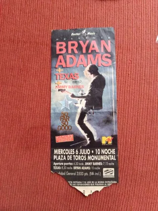 Entrada para el concierto de Bryan Adams. - Fecha: Miércoles 6 de Julio. - Lugar: Plaza de Toros Monumental. - Artistas: Bryan Adams, Texas, Jimmy Barnes. - Precio: 3500 pts (IVA incluido).