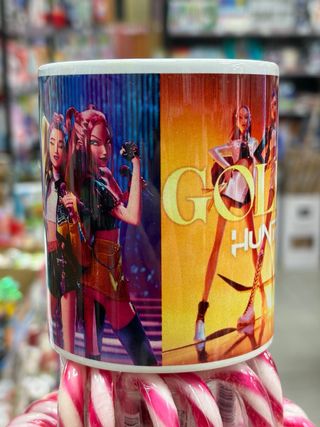 Taza con diseño inspirado en el K-Pop, con la temática Gold Hunter. - Ilustración de figuras femeninas. - Colores vibrantes y degradados.