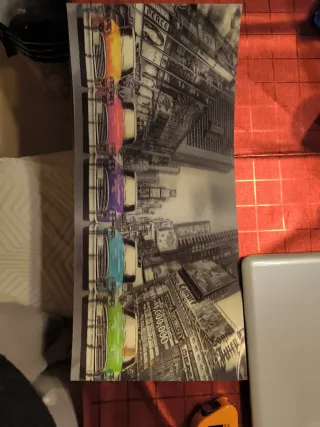 Lámina decorativa con efecto 3D. - Diseño de coches de colores en ciudad. - Imagen urbana con rascacielos y carteles publicitarios.