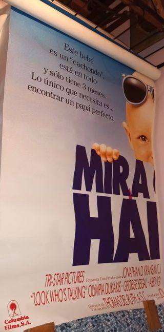 Cartel de la película Mira quien habla (Look Who's Talking) de 1989. - Película de Tri-Star Pictures. - Protagonizada por John Travolta y Kirstie Alley. - Diseño con el bebé y el título principal. - En buen estado. - Medidas 100x150mm