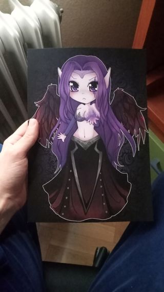 Póster de arte estilo chibi con un ángel oscuro. - Diseño detallado con alas oscuras. - Colores vibrantes en morado y negro. - Estilo de ilustración de fantasía.