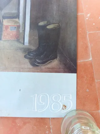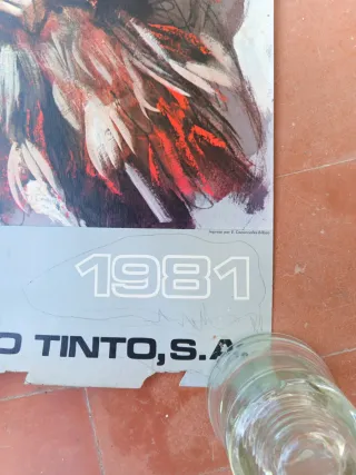 Póster antiguo o vintage de calendario del año 1981, con una ilustración artística. - Ilustración de una mujer con vestimenta tradicional y un rifle. - Incluye el logo de Unión Explosivos Río Tinto, S.A. - Año: 1981.