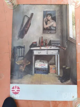 Póster antiguo o vintage de calendario del año 1985 de ERT. - Ilustración de Aguila Avia 1985. - Diseño con motivos de caza y un retrato de Unión Española 1929. - Incluye el logo de ERT.