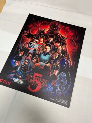 Cartel Poster Stranger Things Temporada 5 Netflix. Tiene unas dimensiones de 36x45 cm aproximadamente (ancho x alto). Esta impreso en PVC Forex de 5mm blanco, material rigido. Tintas UVI, totalmente resistente en exterior y a condiciones meteorológicas adversas. - Diseño con el elenco principal y el villano. - Incluye logo de Netflix. - Fecha de lanzamiento: Vol. 1 Nov 26, Vol. 2 Navidad, El Final Nochevieja.