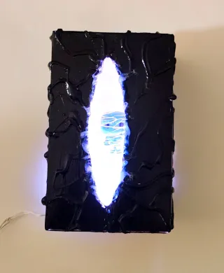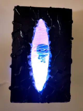 Caja portal inspirada en Vecna de Stranger Things. Ideal para coleccionistas. - Diseño oscuro con detalles brillantes. - Elementos de luz LED integrados. - hecho a mano. - material de cartón pintado a mano,luces led a pilas y funkos pop Kinder joy de vecna. - medidas: alto 13cm,ancho 8 cm,fondo 8 cm.